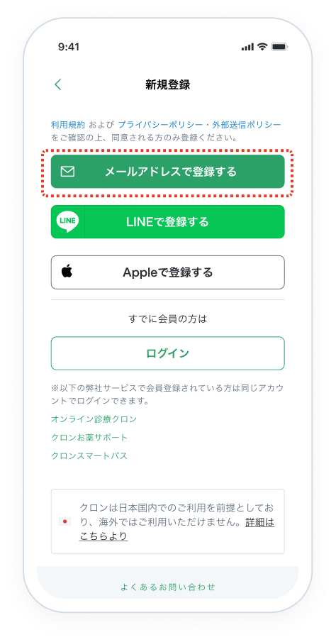 メールアドレスとパスワードで登録される方は「メールアドレスで登録する」を選択します。